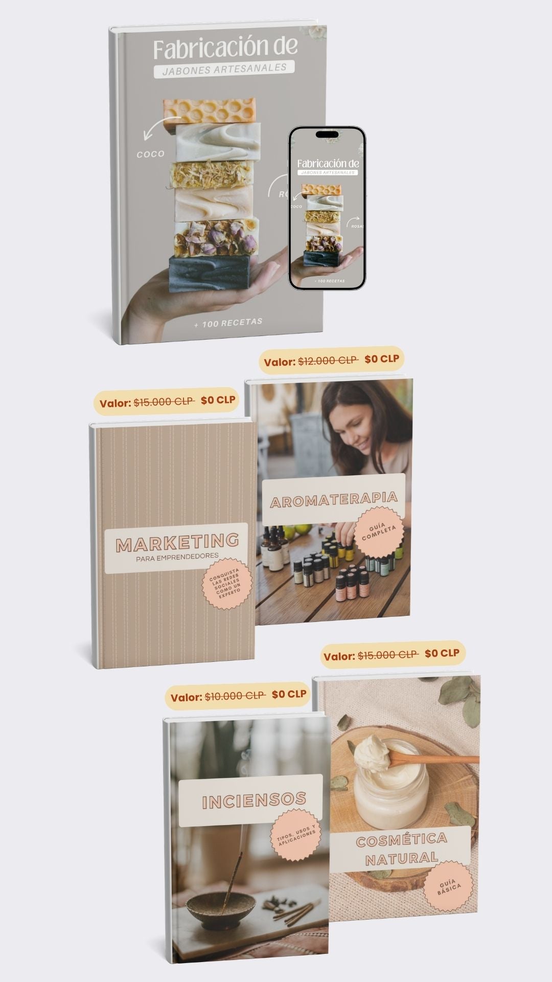 Accedes a un libro digital práctico, diseñado como un método paso a paso para llevarte de cero a jabones artesanales listos para vender, sin relleno ni teoría innecesaria.