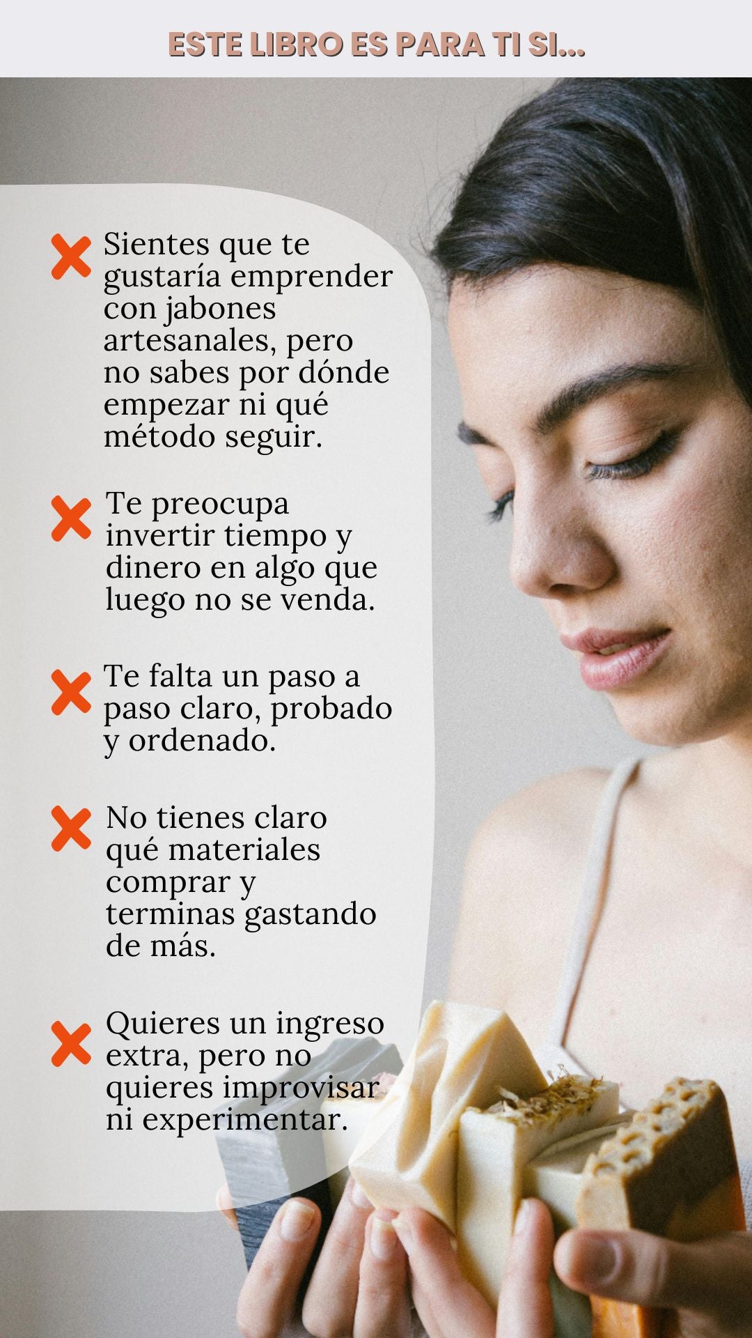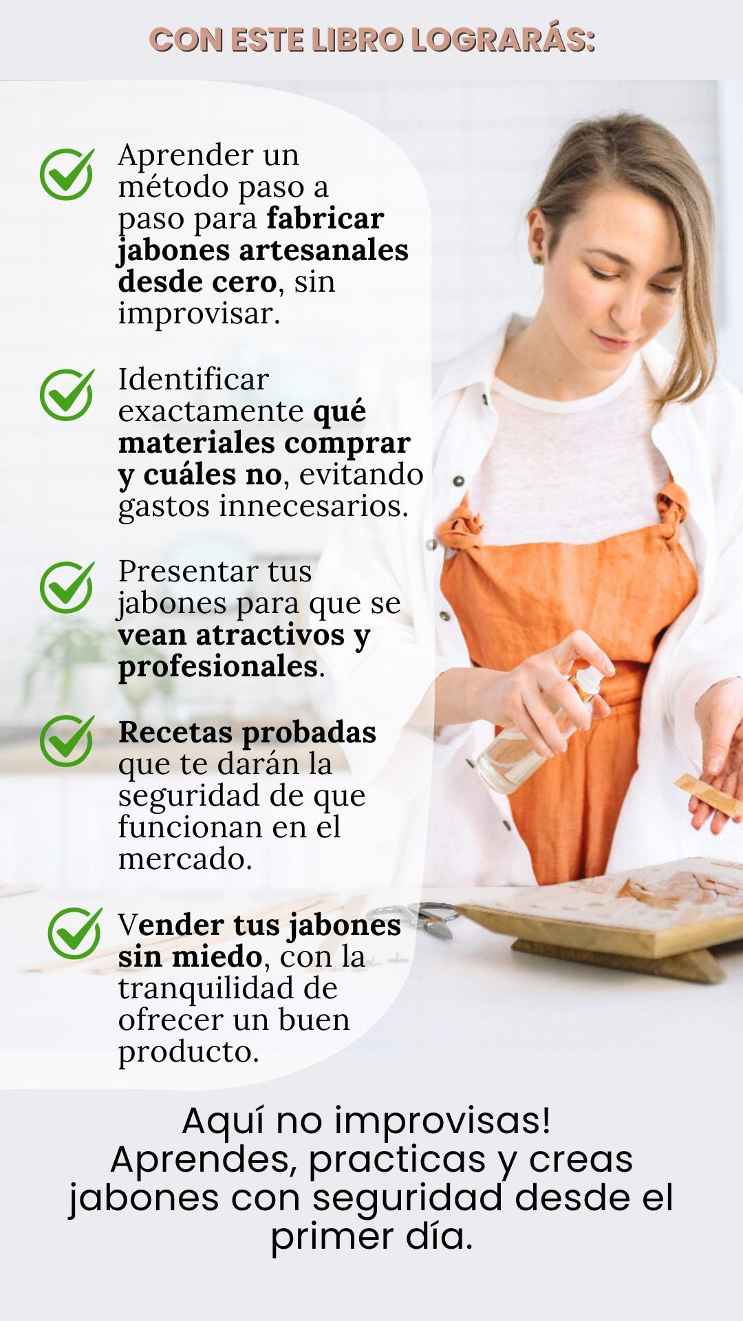 El libro está enfocado en fabricar jabones con criterio comercial, pensando en costos, presentación y valor percibido, no solo en que queden “bonitos”.